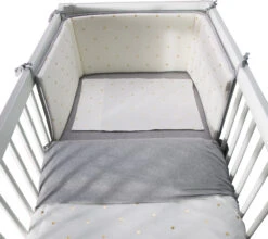 Dieses Nestchen schützt Ihr Baby davor, sich das Köpfchen an den Gitterstäben des Bettes zu stoßen. Es kann beidseitig verwendet werden, so dass Sie die Wahl zwischen einer dezenten, einfarbigen Seite und einer Seite aus Baumwolljersey mit zarten Punkten haben.